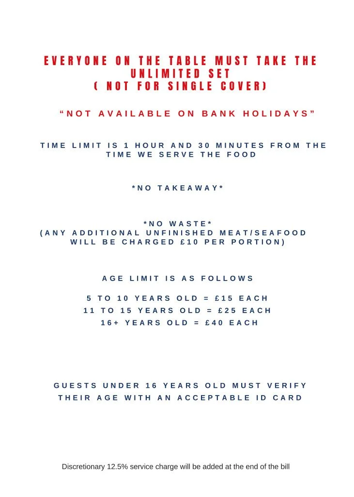 UNLIMITED BBQ MEAT SET, £40 PER PERSON- MONDAY TO THURSDAY.